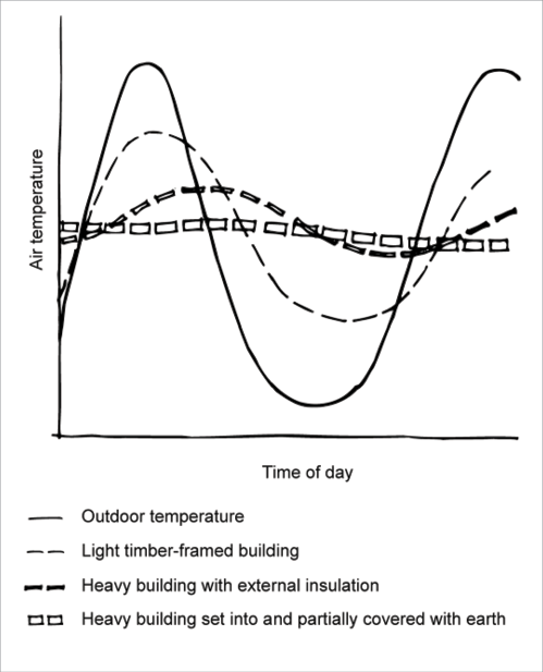 In cool or cold climates where supplementary heating is often used, houses benefit from high mass construction regardless of diurnal range (e.g. Hobart 8.5°C). In tropical climates with diurnal ranges of 7°−8°C (e.g. Cairns 8.2°C) high mass construction can cause thermal discomfort unless carefully designed, well shaded and insulated.